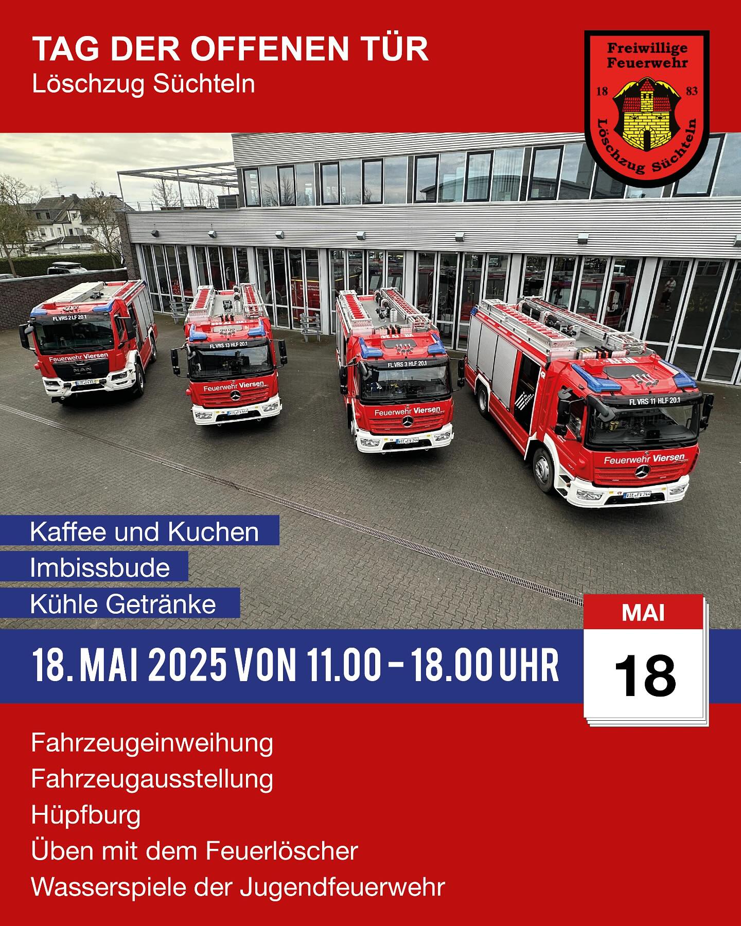 Ein Tag voller Action, Information und Gemeinschaft erwartet die Besucher am 18. Mai, ab 11 Uhr, am St. Florian-Platz in Süchteln. Der Löschzug Süchteln der Viersener Feuerwehr öffnet seine Tore und lädt Groß und Klein ein die Faszination Feuerwehr hautnah zu erleben.