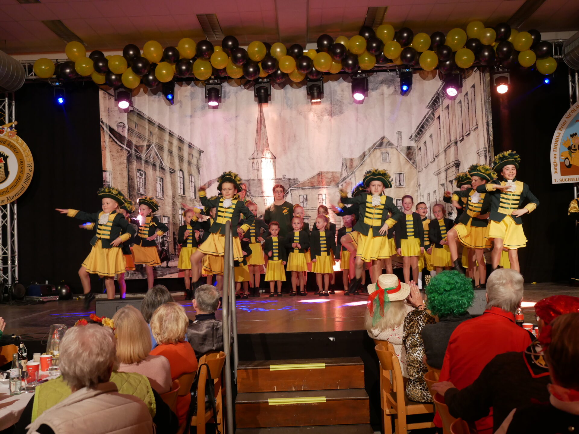 Nahtlos schloss sich die Kapellengarde des Festausschusses Süchtelner Karneval unter der Leitung von Michelle Cremer an. Moment, da hatten sich doch noch andere Farben unter das bekannte Gelb-Schwarz gemischt. Richtig, auch Tänzerinnen der KV De Üüle aus Dölke waren gerne auf der Bühne zu Gast, um gemeinsam mit ihrem Medley zu brillieren. Und noch jemand stach heraus … das Süchtelner Kinderprinzenpaar, welches, wenn sie nicht gerade regieren, das Tanzbein gekonnt schwingt.