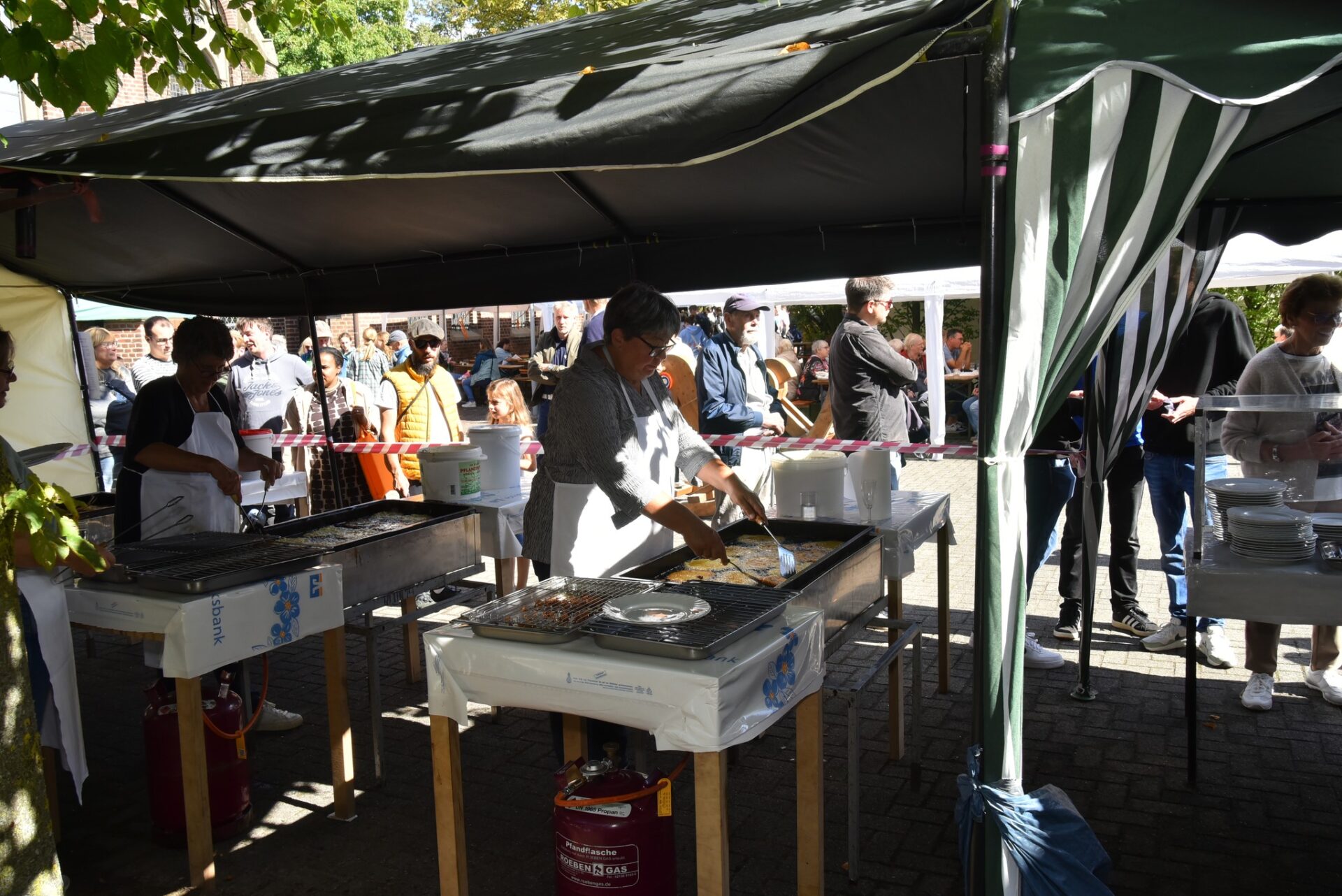 Nach der Messe strömten die Besucherinnen und Besucher auf den Pastor-Lennartz-Platz, in die Nähe des Josef-Lind-Hauses und zur Bockerter Grotte. Hier entfaltete sich das bunte Treiben, das man schon von weitem hören und riechen konnte. Der Duft von frisch gebackenen Reibekuchen – einer Bockerter Spezialität – mischte sich mit dem Aroma von Gegrilltem. Kaffee, Kuchen und Waffeln lockten nicht nur die Erwachsenen an die Stände. Schnell bildeten sich kleine Schlangen, während in geselliger Runde alte Bekannte ins Gespräch kamen und neue Kontakte geknüpft wurden. „Genau diese Mischung macht es aus“, schwärmte eine Besucherin. „Man fühlt sich hier einfach zu Hause – egal, ob man seit Jahrzehnten zur Gemeinde gehört oder zum ersten Mal vorbeischaut.“