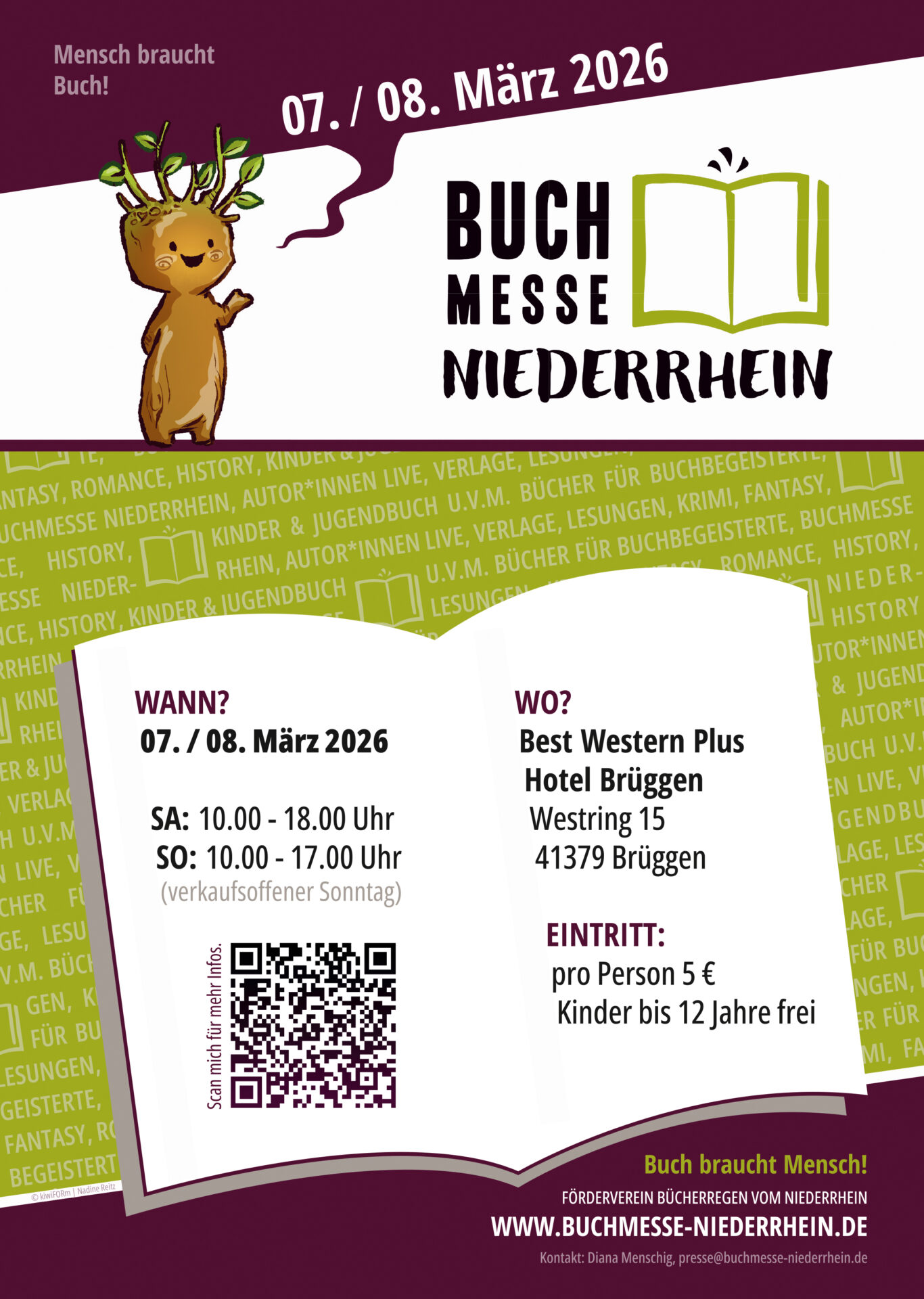 Brüggen – Am 7. und 8. März 2026 findet die 1. Buchmesse Niederrhein statt. Veranstaltungsort ist das Best Western Plus Hotel in 41379 Brüggen, Westring 15. In vier Tagungsräumen und einem weiteren Raum bieten Autor:innen ihre Bücher aus einem breitgefächerten Genremix von Lovestory, Krimi, Thriller, über Fantasy und Lyrik bis Cosycrime, Historienroman usw., also eine literarische Vielfalt für Erwachsene, und Kinderbuchautor:innen für Jugendliche und Kinder an.