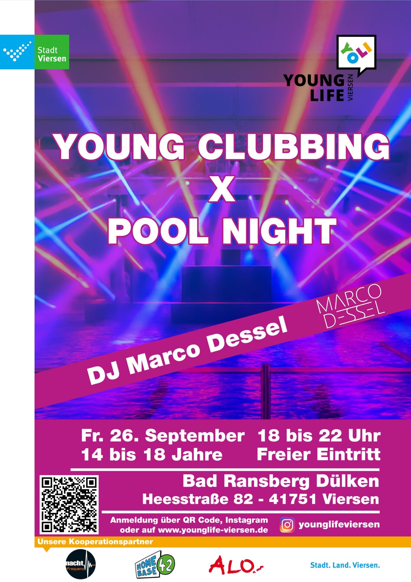 Organisiert wird die Veranstaltung vom Team Younglife, das zur Abteilung Kinder-, Jugend- und Familienförderung der Stadt Viersen gehört. Die Jugendzentren Homebase42 und ALO beteiligen sich. Die Veranstaltung richtet sich gezielt an Jugendliche, das Motto lautet „alkoholfrei und sicher“. Für die Sicherheit sorgen im Rettungsschwimmen ausgebildete Personen und das Betreuungspersonal vor Ort. Die Teilnahme ist nur nach Anmeldung möglich. Ein entsprechendes Online-Formular ist über einen QR-Code auf Flyern und Plakaten sowie über die Sozialen Medien erreichbar. Der Eintritt zur „Young Clubbing X Pool Night“ ist kostenlos. Die Teilnehmerzahl ist begrenzt. Eine frühzeitige Anmeldung wird deshalb empfohlen.