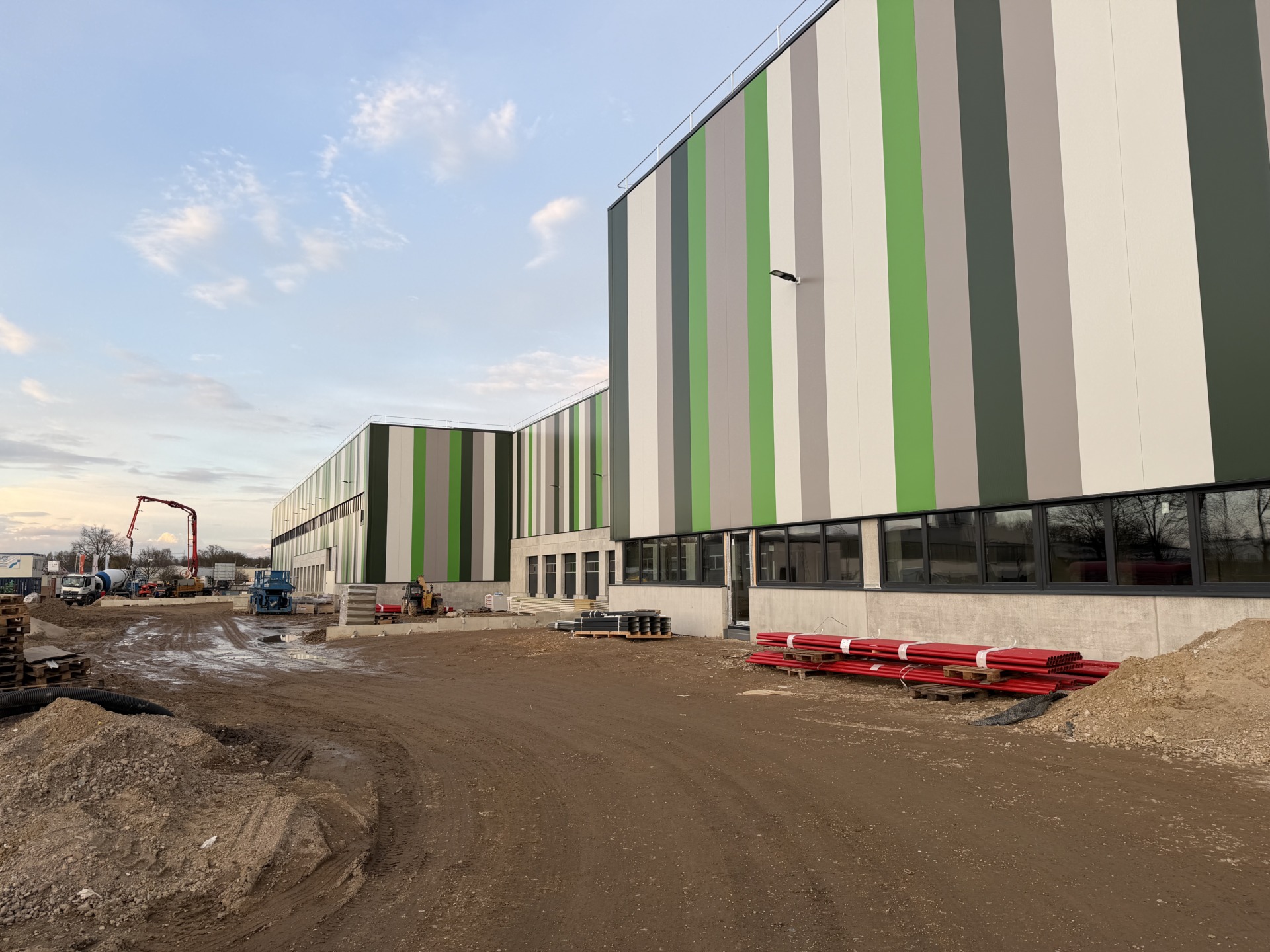 Die Immobilie selbst ist auf Effizienz und Flexibilität ausgelegt. Nach Abschluss der Bauarbeiten soll sie über rund 16.500 Quadratmeter Hallenfläche verfügen. Diese verteilen sich auf zwei Hallenschiffe mit etwa 7.100 und 9.400 Quadratmetern. Hinzu kommen rund 820 Quadratmeter Lagerfläche auf einer Mezzanine-Ebene, also einer Zwischenebene innerhalb der Halle, die zusätzliche Kapazitäten schafft. Im Erdgeschoss entstehen etwa 500 Quadratmeter Büro- und Sozialräume für Verwaltung und Mitarbeiter, während auf der Zwischenebene weitere 440 Quadratmeter Nutzfläche vorgesehen sind.